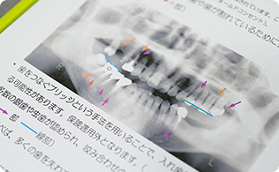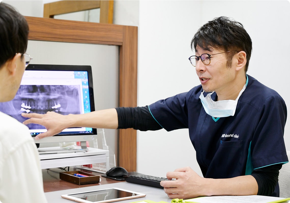 診療台の上でお口を開けた状態では「歯科医師→患者さん」という一方通行なコミュニケーションになりがちです。そこで当院では、まずFace to Face(対等の対面スタイル)で患者さんと対話します。レントゲン写真を見ながら患者さんが望むゴールが何かをお聞きし、そのための治療計画を立てていきます。